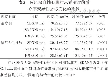 2. HRV指标变化的比较(表2):治疗前,两组患者的HRV指标——SDNN、SDANN及RMSSD差异均无统计学意义(P均>0.05);治疗3个月后,两组患者的HRV指标水平均较治疗前升高,差异有统计学意义(P均<0.05),且观察组SDNN、SDANN及RMSSD水平高于对照组,组间差异有统计学意义(P均<0.001)。