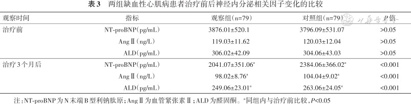 共入选了158例ICM患者,对照组和观察组各79例,两组患者基线特征比较,差异无统计学意义(P均>0.05)。治疗3个月后,两组患者的SDNN、SDANN及RMSSD水平均较治疗前升高,差异有统计学意义(P均<0.05),且观察组的SDNN、SDANN及RMSSD水平高于对照组,组间差异有统计学意义(P均<0.05)。治疗3个月后,两组患者的NT-proBNP、AngⅡ及ALD水平均较治疗前降低,差异有统计学意义(P均<0.05);且观察组NT-proBNP、AngⅡ及ALD水平低于对照组,组间差异有统计学意义(P均<0.05)。治疗3个月后,观察组MACEs发生4例(5.06%),对照组MACEs发生7例(8.86%),两组间差异无统计学意义(P>0.05)。