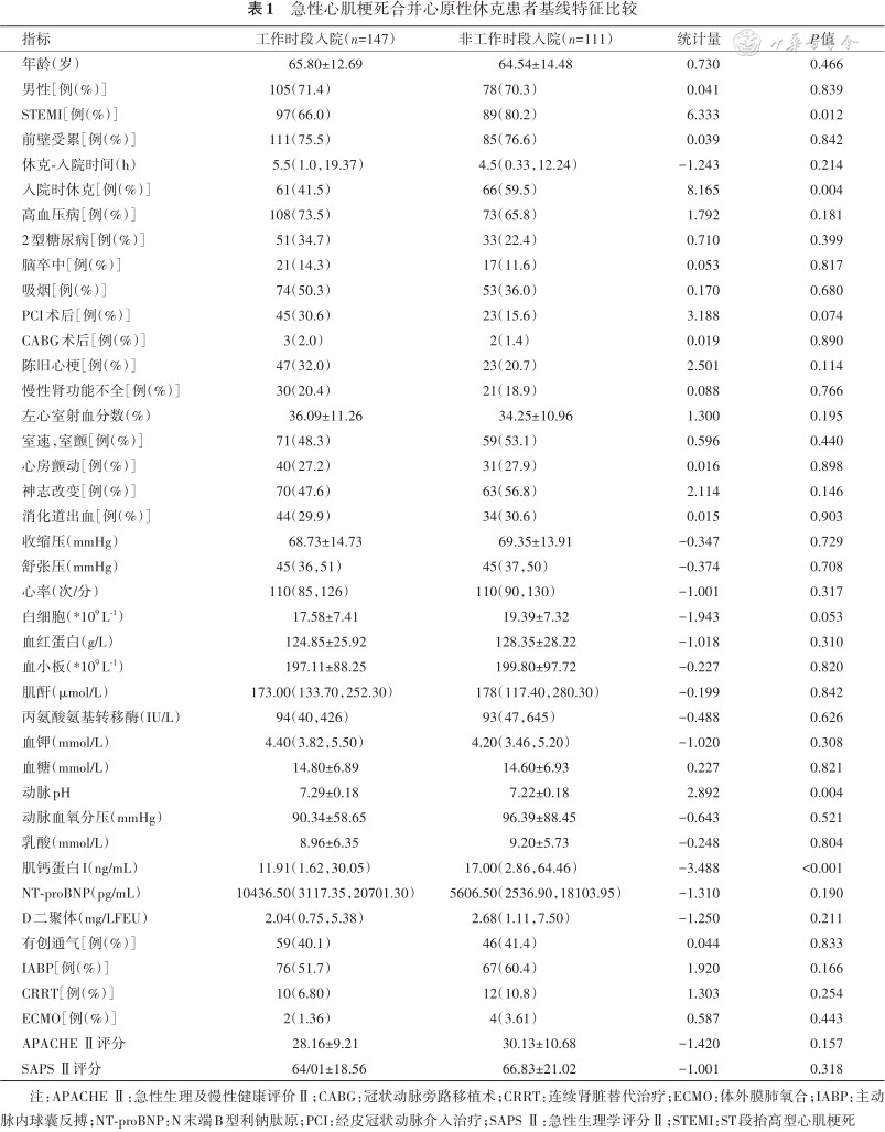 2. 研究方法:(1)研究对象根据入院时间分为工作时段和非工作时段两组。工作时段定义为工作日的工作时段(8点至20点);非工作时段定义为周末、节假日全天以及工作日20点至次晨8点。患者接受急诊冠状动脉造影、介入治疗的适应症、禁忌症由当日值班术者或三级医师评估,并结合患者及家属意愿综合决定。(2)临床资料的收集:收集患者临床特征、既往史、出院诊断及CS明确诊断后的生命体征、血常规、血生化、凝血、血气分析、心肌标志物等(上述指标均以CS诊断明确后第一个24小时内最差值计),同时计算急性生理及慢性健康评价Ⅱ(Acute Physiology And Chronic Health Evaluation II,APACHE II)、简化急性生理学评分Ⅱ(Simplified Acute Physiology Score II,SAPS II),并采集患者冠状动脉造影特征、介入处理方式、循环支持等,并通过病例资料记载或对患者或家属进行电话随访,了解患者28天的全因死亡情况。