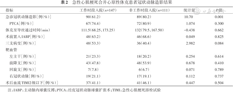 2. 冠状动脉造影结果:共179例患者(69.4%)接受了急诊冠状动脉造影(其余患者未接受造影的原因包括医师决策因素、患者及家属意愿因素、经济因素、风险承担因素等),84例(46.9%)为三支病变,94例(52.5%)术前接受主动脉内球囊反搏(intra-aortic balloon pump,IABP)支持,39例(21.8%)患者罪犯血管为左主干,91例(50.8%)罪犯血管为前降支。与工作时段入院者相比,非工作时段入院者接受急诊冠脉造影比例更高(80.2%比61.2%,P=0.001),而休克至血管开导丝通过时间、术前置入IABP、三支病变、靶血管分布、术后血流TIMI2级以下比例等方面,两组比较差异均无统计学意义(P均>0.05)(表2)。