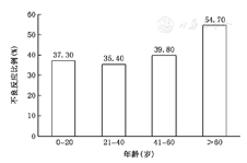 不良反应在不同年龄段的发生情况:发生不良反应的患者平均年龄(37.7±12.5)岁,不同年龄阶段发生不良反应的比例见图1。