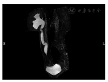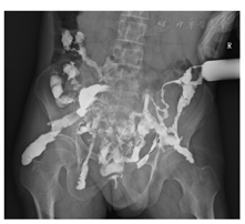 入院后查体:体温39 ℃,消瘦(体重指数16.65 kg/m2),中下腹轻压痛,腰骶部可见3处皮肤瘘口伴脓性分泌物。血白细胞计数8.51×109/L,中性粒细胞比例84.2%,血红蛋白69 g/L,血小板计数335×109/L。白蛋白24 g/L,红细胞沉降率87 mm/h,C反应蛋白120 mg/dl。腰骶部脓性分泌物培养结果示肺炎克雷伯菌、光滑假丝酵母菌阳性。结肠镜进镜至距肛缘约60 cm见结肠内瘘口,局部肉芽组织增生,降结肠及脾曲见另两处瘘口形成(图1)。窦道造影可见水溶性造影剂经皮进入窦道,中下腹部多发窦道显影,与小肠、横结肠相通(图2)。小肠CT示克罗恩病术后改变,空肠、盆组回肠克罗恩病活动期改变伴小肠-结肠管内瘘形成,病变肠管与双侧髂肌、右侧闭孔内肌、骶前区多发瘘管形成;骶骨周围、左侧坐骨直肠窝蜂窝织炎及脓肿;双侧臀大肌多发脓肿;右侧输尿管下段与病变肠管粘连,右侧输尿管积水(图3)。磁共振尿路造影示右侧输尿管下段狭窄伴右肾及输尿管中上段扩张积水(图4)。