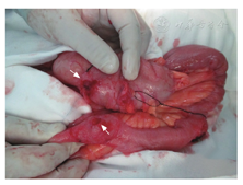经抗感染(亚胺培南联合氟康唑静滴,甲硝唑联合呋喃唑酮冲洗窦道)与肠内肠外营养支持(肠外营养700 kcal/d+口服全肠内营养500 kcal/d,1 kcal=4.184 kJ)治疗6周后,患者体温恢复正常、瘘道渗出明显减少,腰骶部疼痛症状改善,复查血常规提示:白细胞计数7.67×109/L,中性粒细胞比例80.2%,血红蛋白63 g/L,血小板计数295×109/L,白蛋白28 mg/L。于2015年7月行"剖腹探查+双侧输尿管支架置入+肠粘连松解+肠内瘘修补+部分小肠切除+末端回肠造瘘术"。术中见腹腔内广泛粘连,未见明显脓液集聚,清亮腹腔积液约300 ml,见两处原小肠切除吻合口(分别位于距屈氏韧带100 cm和回盲瓣近端10 cm);距屈氏韧带160 cm病变小肠与横结肠中段形成回肠-横结肠内瘘(图5),于骶前包裹固定,并向后穿透腰大肌形成肠皮瘘;病变小肠粘连成团,侵及侧腹膜,包绕并压迫右侧输尿管。术中切除22 cm病变小肠及受累阑尾,近端小肠于右下腹行单腔造口,远端小肠封闭后旷置;楔形切除受累横结肠肠壁组织,于骶前置入双套管引流;术中探查残余小肠共180 cm。术后病理提示:"部分小肠、横结肠"黏膜水肿,局部黏膜糜烂、脱落、灶性出血及息肉状增生,全层炎细胞浸润,黏膜下非干酪样肉芽肿形成,黏膜下淋巴管扩张,局部浆膜面血管扩张、淤血,符合克罗恩病。