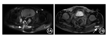 术后持续低压双套管冲洗引流10 d后拔出内套管,留置外管继续引流,口服全肠内营养(1 500 kcal/d,1 kcal=4.184 kJ)近1个月。患者体温正常,体重增长3 kg,白蛋白升高至35 g/L,营养状况明显改善,手术切口及皮肤瘘口恢复良好(图6)。术后1个月复查腹部磁共振(magnetic resonance,MR)提示:两侧后腹膜、盆壁、骶尾前区、双侧臀大肌仍有窦道及多发脓肿形成,但较术前明显好转(图7)。遂开始口服硫唑嘌呤25 mg/d,改全肠内营养为半肠内营养。