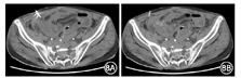 术后2个月余患者突发高热,体温42 ℃,骶尾部查体可及无波动感包块,经皮行穿刺术,未见脓液引出。CT引导下穿刺引流术,术中可见回结肠肠壁增厚,肠管周围积液,腹膜及肠系膜增厚伴盆腔渗出,未见脓液成分,穿刺后未留置引流管(图8)。血培养示脑膜败血伊丽莎白黄金杆菌阳性。经积极抗感染(亚胺培南联合甲硝唑静脉滴注)治疗后,患者体温始终波动于38~40 ℃。因患者病情再次加重,故进行第二次多学科讨论。