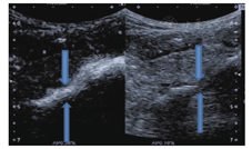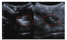 克罗恩病典型的超声表现:(1)肠壁增厚(≥4 mm)[1,2,3,4]。受累肠壁因水肿增厚横切面呈"靶环征",纵切面呈"水管征"或"三明治征"。(2)疾病活动期肠壁血供丰富。(3)多节段受累,可累及全消化道。(4)其他:梗阻、脓肿等超声表现。