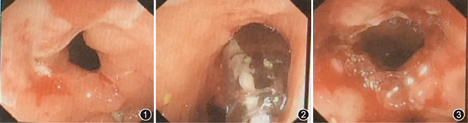 19例(19/22)首次EBD术治疗成功,其中17例治疗后内镜可通过原肠腔狭窄部位且梗阻症状缓解,2例仅梗阻症状缓解。3例首次EBD术治疗不成功,其中1例改行内镜下肠腔狭窄切开术,2例EBD手术失败改行外科肠切除手术。22例治疗后均未出现大出血、穿孔、感染等并发症,无术后死亡病例。22例中1例克罗恩病患者小肠-结肠吻合口狭窄,EBD术治疗前、术中和术后肠镜图像见图1,图2,图3。