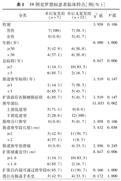 | 既往有肠道手术史 | 3(42.9) | 4(33.3) | 0.172 | 1.000 | |