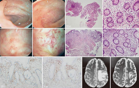 肠镜检查:2015年11月肠镜检查示全结直肠弥漫性充血水肿,多个直径约0.2 ~ 0.8 cm溃疡,溃疡间可见部分正常黏膜(图1)。肠黏膜病理镜检示黏膜息肉样隆起,部分区域纤维化、水肿,灶性重度慢性炎及部分腺体扭曲,未见肉芽肿及隐窝脓肿(图2)。免疫组化染色黏膜内浸润的淋巴细胞CD3ε(+),CD20(-),原位杂交EBV编码的小RNA(EBER)阳性。