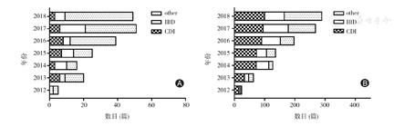 目前已发表的文献及已注册的临床试验主要涉及FMT治疗CDI和IBD,其中CDI一直是研究的热点,IBD的文献发表量呈现逐年递增趋势,见图1。FMT的方法学、临床决策、安全性和疗效以及治疗其他疾病的研究相对较少。与欧美相比,中国的FMT研究主要集中在IBD、便秘、重症感染、肝病等[17,21,22,23,24]。