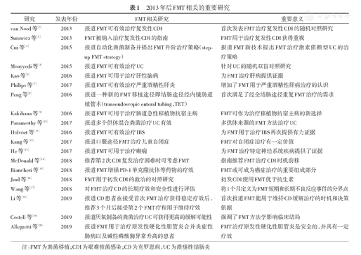 截至2019年3月20日,PubMed中共可检索出1232篇已发表的FMT相关文献。2013年后FMT相关的重要研究见表1。