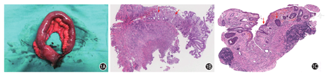 (1)大体上表现为环形溃疡,肠壁僵硬,肠腔狭窄,切面可见肠壁纤维组织增生。(2)显微镜下常见溃疡或糜烂,同时伴有上皮再生、修复,黏液减少,核染色质过深,核仁增大,核分裂像活跃,有时易误诊为异型增生,但适中的核浆比加上缺血背景有别于异型增生(图1C)。隐窝萎缩,隐窝出现分支、变形,潘氏细胞化生和幽门腺化生均可出现。比较有提示意义的是固有层纤维化,黏膜内淋巴细胞、浆细胞较少,可见含铁血黄素沉积。