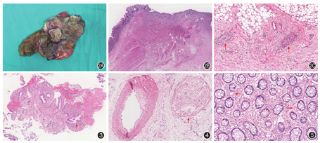 病因不明,东方人多见,可累及各级血管,主要累及小血管,动脉、静脉均可累及。白塞病累及消化道以回盲部为多,典型者为界清、深大、孤立的溃疡,近似圆形(图2A),深达肌层甚至穿透肌层,少数病例见多个溃疡。显微镜下,溃疡导致肠壁4层结构破坏,溃疡与周围黏膜无移行(图2B)。黏膜下层、浆膜层及肠系膜内可见血管炎,伴血管损伤;常见淋巴细胞性血管炎(图2C),病变部位以小静脉为主,表现为血管壁内淋巴细胞浸润,血管壁增厚,血管腔狭窄甚至闭塞[6]。