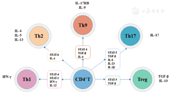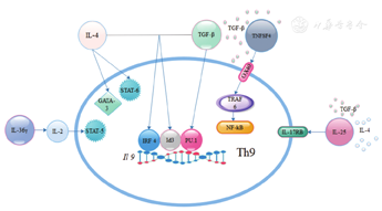 另外,目前新观点认为,分泌IL-9的T细胞亚群是原始CD4+ T细胞在胞外细胞因子微环境发生变化时激活形成的一群"瞬时"细胞。在其形成过程中,会抑制其他T细胞亚群,比如Th17、Tregs的形成。因此,"Th9"细胞亚群的形成会导致其他T细胞亚群分化失衡,也会促进IBD的发展。
