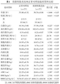 | 临床资料 | 正常对照组(n = 57) | 放射性肠炎组(n = 57) | 统计值 | P值 | |