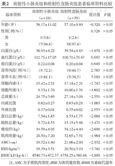 | 临床资料 | 放射性小肠炎组(n = 18) | 放射性直肠炎组(n = 39) | 统计值 | P值 | |