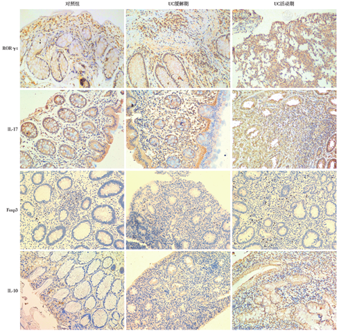 Th17和Treg细胞相关转录因子(RORγt、Foxp3)均为胞核表达,细胞因子(IL-17、IL-10)均在胞质中表达,见图1。与对照组相比,UC患者结肠组织中RORγt、Foxp3、IL-17、IL-10的表达强度均明显增高(P均<0.05),且活动期高于缓解期(P均<0.05)。采用RORγt/Foxp3比值来表示结肠组织中Th17/Treg细胞比例,结果显示,UC患者结肠组织中RORγt/Foxp3比值明显高于对照组(P均<0.05),且活动期明显高于缓解期(P均<0.05),见表2、表3。