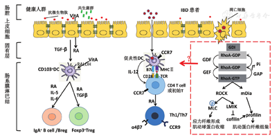 炎症性肠病(inflammatory bowel disease,IBD)是一种病因未明的胃肠道慢性炎症性疾病,其临床特征、组织病理学表现及免疫抑制剂的疗效都表明免疫因素在发病机制中起关键作用,针对调节免疫细胞的生物治疗和细胞内信号传导通路的靶向治疗也成为研究的热点。而树突状细胞(dendritic cell,DC)在黏膜免疫过程中起到至关重要的作用。DC作为最有效的抗原提呈细胞(antigen presenting cell,APC),可以摄取加工抗原并将其迁移至淋巴结,将抗原呈递给T、B细胞,诱导相应淋巴细胞分化,产生不同的免疫应答。在正常黏膜免疫中,DC诱导分泌抗原特异性IgA的B细胞和调节性T细胞(Treg)的产生,维持对自身抗原的免疫耐受,同时保持针对入侵病原体的主动免疫应答能力[1]。而在IBD中,DC针对入侵病原菌的免疫控制发生失调,导致以Th1、Th17等占主导地位的过度炎症反应[2,3],损伤肠壁,破坏肠黏膜屏障。RhoA作为免疫细胞分化和功能的关键调节剂,与DC的形态、增殖、抗原摄取、细胞迁移及抗原提呈等功能密切相关。DC功能变化可能与细胞中RhoA信号通路异常有关。过去的研究主要集中于适应性免疫在IBD发病中的作用,较少涉及DC的免疫功能。本综述将特别关注DC及其RhoA信号通路在IBD发病中的潜在作用,为研究和治疗这一疾病提供新的切入点。