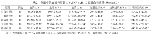 乳清蛋白组结肠组织IL-6水平与其他各组相比,差异均无统计学意义。乳清蛋白组的结肠组织TNF-α水平却高于一般饮食组(P=0.013),IL-10水平明显高于大豆蛋白组(P=0.029)和酪蛋白组(P=0.040)。一般饮食组结肠IL-10水平高于大豆蛋白组(P=0.027)和酪蛋白组(P=0.016)。