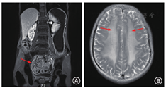 影像学检查:小肠MRI示结肠回盲部、下腹回肠肠管管壁呈较广泛不同程度肿胀、增厚(图1A),考虑为炎性改变;胆汁淤积;胃呈无力型改变。颅脑MRI示中脑、脑桥、双侧小脑半球及双侧丘脑、基底节区、半卵圆中心弥漫性片状较对称异常信号影;双侧筛窦炎,左侧蝶窦内结节状影,性质良性,黏膜囊肿可能(图1B)。