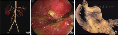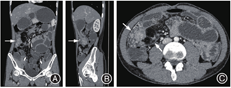 影像学检查:入院后给予禁食和静脉补液后患者腹痛缓解、肛门排气恢复,遂行全腹CT平扫加增强,显示右中下腹局部小肠肠壁水肿增厚,增强后明显充血,周围脂肪间隙浑浊伴多发渗出,见一3.5 cm × 4.1 cm的不规则软组织团块影,见图1A、1B;病变肠管周围多发扩张、迂曲血管影,见图1C;病灶近端肠管扩张,远端肠管内见多量液体。肠系膜上动脉CTA示动脉走行良好,未见充盈缺损或瘤样扩张,见图2A。