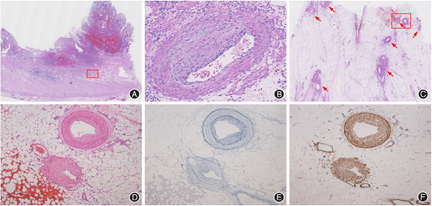 镜下观察:狭窄处小肠可见深达固有肌层的溃疡,同时伴急性浆膜炎和浆膜下层纤维化,溃疡周边肠黏膜示活动性慢性肠炎伴幽门腺化生和假息肉形成,见图3A,部分肠壁黏膜下层消失,并与固有肌层纤维性融合。狭窄区黏膜下层、浆膜下层和肠系膜内多数小至中等大小的静脉管壁异常,表现为静脉内膜平滑肌不规则增生,导致受累静脉管腔狭窄、甚至闭塞,无血管炎、血管内血栓和管壁周围纤维化等改变,伴行动脉无明显异常,见图3B~3D。经广泛取材未见肿瘤、透壁性炎症、肉芽肿等特异性组织学改变,近端扩张肠管示局部黏膜糜烂,肠壁及系膜内血管未见异常。弹力纤维染色显示增生的静脉内膜区域,免疫组化显示静脉内膜平滑肌肌动蛋白(smooth muscle actin,SMA)阳性,见图3E、3F。最终病理诊断为特发性肠系膜静脉肌内膜增生症(idiopathic myointimal hyperplasia of the mesenteric veins,IMHMV)。