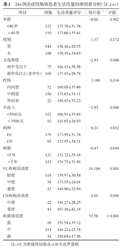 244例炎症性肠病患者生活质量的单因素分析(分,
