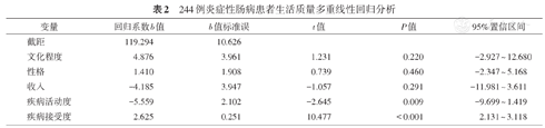 IBD是一种慢性肠道非特异性疾病,具有长期性、终身性和不可治愈性,导致患者难以接受疾病[10,11],从而影响了生活质量。虽然医护人员在治疗过程中进行干预,但IBD患者的生活质量仍然不高,应引起临床工作的重视。我们对IBD患者的生活质量进行单因素和多因素分析,结果发现患者生活质量主要受疾病接受度和疾病活动度影响,与其他因素不相关。