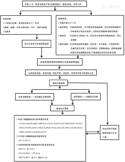 疑诊VEO-IBD的患儿常需要先排除感染、牛奶蛋白过敏、乳糜泻等疾病,若存在以下报警状况时推荐完成基因检测(一代和二代测序技术)和目标基因的功能验证:(1)发病年龄小于2岁;(2)临床特征:①临床症状重,呈不断恶化进展趋势;②对IBD常规治疗方案反应较差;③伴有肛周脓肿/瘘管等病变;(3)家族史:①有新生儿期死亡史;②有自身免疫性疾病的患者;③近亲婚配;(4)肠外表现:①非典型病原体感染;②皮肤、关节病变、口腔溃疡等;③淋巴系统异常;④发育畸形;⑤慢性肺病;⑥噬血细胞性淋巴组织细胞增多症/巨噬细胞活化综合征(HLH/MAS)样表现等[3,9,10]。无论何种基因检测手段都存在一定局限性,故需结合免疫细胞功能、转录水平、蛋白质表达、信号转导通路分析等技术,弥补基因测序存在的不足。除了微观层面,更需要整合临床、遗传、免疫和多组学等多维度数据以提高对疾病诊断和分型的精准度[11,12]。VEO-IBD的诊治流程见图1。