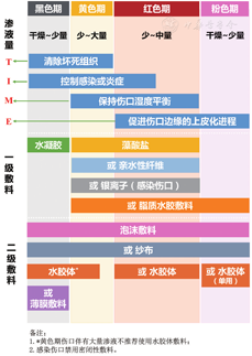 VEO-IBD患儿伤口并发症发生率达34.9%,多发生于术后7 ~ 14 d,以伤口感染和伤口裂开为主。造口的排泄物会污染及刺激伤口,而伤口的存在又会影响造口底盘的粘贴。一旦发生两者其一或共同发生并发症时,会互相影响导致进一步恶化。规律及规范的伤口评估尤为重要。可采用伤口评估三角对伤口进行评估,包括(1)伤口床评估(组织类型、渗出液、感染);(2)伤口边缘评估(浸渍、脱水、潜行、边缘增厚/卷起);(3)伤口周边皮肤评估(浸渍、表皮脱落、皮肤干燥、湿疹等)[102]。伤口并发症应以预防为主,对于存在发生伤口并发症危险因素的患儿,如C-反应蛋白升高(OR:1.40)、wPCDAI评分升高(OR:2.88)以及术前存在肠穿孔(OR:1.72),术后可预防性的使用水胶体敷料覆盖伤口以阻隔造口排泄物,避免排泄物污染伤口造成感染[22]。发生伤口并发症后,应基于TIME原则行伤口床处理,即清除坏死组织(tissue)、控制感染或炎症(infection or inflammation)、保持伤口湿度平衡(moisture)、促进伤口边缘的上皮化进程(edge)[103]。此外,还需根据伤口所处的不同时期合理选择敷料(图2)。伤口并发症需要多学科团队综合管理,应及时转介,共同处理。