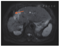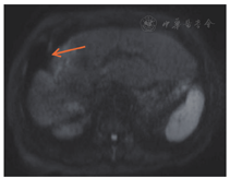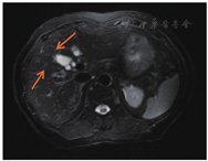 术后半年内接受12个疗程FOLFIRI化疗方案(伊立替康170 mg/m2,ivgtt+氟尿嘧啶300 mg/m2,ivgtt+氟尿嘧啶1.0 g/m2,civ+亚叶酸钙360 mg/m2,ivgtt),2016年6月复查肝脏增强磁共振提示肺部CT均未见转移或复发征象。2016年9月肝脏增强磁共振提示:术区周围及肝右叶多发环形强化小结节,首先考虑转移,腹膜后多发淋巴结,部分增大(图6)。2016年10月开始接受4个疗程西妥昔单抗+伊立替康单药化疗(伊立替康170 mg/m2+西妥昔单抗800 mg,ivgtt);2016年12月肝Ⅷ段转移灶及腹膜后淋巴结转移灶较前缩小(图7),继续10个疗程西妥昔单抗+伊立替康单药化疗;2017年6月肝转移灶较前明显缩小,继续上述化疗方案。随访至2017年8月19日,患者生存时间超过37个月。