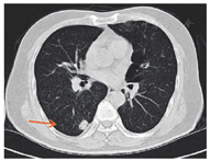 2012年7月起接受6次XELOX方案化疗,此后卡培他滨单药化疗1年;2013年7月影像学检查提示转移灶较前进展,肝脏出现新发转移灶;2013年9月16日针对肝转移瘤行射频消融术,2013年11月复查见肝Ⅷ段近膈顶处出现新病灶(图2)。2014年6月肺部CT未见明确转移灶,2014年11月右下肺考虑转移灶(图3)。2015年3月肺转移瘤较前进展,2015年3月起接受6个疗程FOLFIRI方案化疗(伊立替康150 mg/m2,ivgtt+氟尿嘧啶340 mg/m2,iv bolus+氟尿嘧啶2.2 g/m2,civ+亚叶酸钙330 mg/m2,ivgtt),2015年9月肝肺转移瘤均较前进展,2016年1月21日行肝转移瘤切除术,2016年2月胸部CT提示肺转移瘤进展,患者拒绝肺转移瘤介入治疗,2016年3月和4月行树突状细胞治疗。2017年3月肺CT:肺转移瘤增大,肝脏MRI肝Ⅷ段肿瘤存活(图4A),Ⅵ段新发转移癌(图4B)。2017年3月22日继续行FOLFIRI方案化疗,2017年4月—10月行10次西妥昔单抗+FOLFIRI方案化疗(伊立替康162 mg/m2,ivgtt+氟尿嘧啶365 mg/m2,iv bolus+氟尿嘧啶1.7 g/m2,civ+亚叶酸钙365 mg/m2,ivgtt+西妥昔单抗700 mg,ivgtt),2017年11月—2018年1月行5次西妥昔单抗单药(700 mg, ivgtt)靶向治疗,随访至2018年1月28日,生存时间超过94个月。