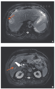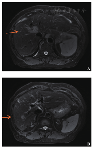 患者77岁男性,因结肠癌术后1年半,发现肝占位2周于2015年12月入院。患者2014年6月行结肠癌根治术(左半结肠),术后经历7个化疗周期(具体方案不详)。2015年12月肝脏增强磁共振示:肝Ⅷ段肿块,大小约32 mm×42 mm×30 mm,考虑转移瘤(图5A);肝门部及后腹膜多发肿大淋巴结(图5B)。肺部CT未见明显异常。肿瘤标志物:癌胚抗原33.8 ng/ml, CA199 493.1 U/ml, CA242 64.4 U/ml, AFP正常。