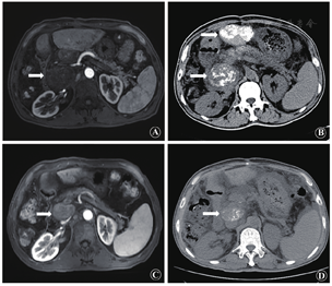 TACE术后给予保肝、护胃抑酸、预防感染、水化等支持治疗。术后第3天复查腹部平扫CT示:肝左叶新发癌灶及腹膜后淋巴结内可见碘油沉积(图1B)。术后第2周开始口服仑伐替尼靶向治疗(12 mg/次,1次/日),并给予静脉输注PD-1(纳武利尤单抗,200 mg/次,2周/次)。口服仑伐替尼后出现腹泻(+++)、乏力(+++)、体重减轻、皮肤反应(+)、高血压(-)、蛋白尿(+)。术后3个月复查甲胎蛋白:110 μg/L。肝脏增强核磁示:肝内未见新发癌灶,腹膜后淋巴结转移瘤较前明显缩小(图1C)。肺平扫CT纵隔窗示:腹膜后淋巴结转移瘤内可见碘油沉积,较前明显缩小(图1D)。后间隔3个月定期复查至2019年8月,肝内病灶稳定,腹膜后淋巴结转移瘤持续缩小。