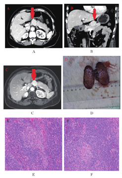 考虑患者无功能胰岛细胞瘤可能性大,行剖腹探查可见胰腺体部上方有一椭圆形红色实性包块紧密生长,肿物直径约3.5 cm,质地硬,有包膜,与胰腺组织界限清晰。手术完整切除包块,术中冰冻提示淋巴结反应性增生。术后标本提示淋巴结1个,镜下淋巴结节结构基本保存,皮质区淋巴滤泡及副皮质区淋巴细胞增生,滤泡生发中心萎缩,伴透明血管穿入现象,套区淋巴细胞同心圆状围绕生发中心呈"洋葱皮"样结构。免疫组化提示CD3及CD5(T细+),CD20(B细胞+),CD21(滤泡树突细胞阳性),CyclinD1(-),Ki-67(滤泡生发中心高表达)(图1D、图1E、图1F)。结合免疫组化,符合透明血管型Castleman病。患者术后恢复良好,1周后出院,术后左上腹隐痛症状未再出现,随访期间无复发。
