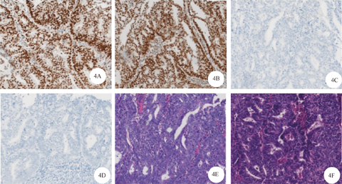 NCCN指南2020年第1版更新的内容,第1次提出了病理联合分子分型进行诊断的概念。基于TCGA 4个分子分型,结合病理分类,根据临床预后将子宫内膜癌分为4种分子亚型,包括POLE突变型、高度微卫星不稳定型、低拷贝型及高拷贝型。注意前3类均为内膜样癌,只有高拷贝型包括除内膜样癌之外的其他高级别内膜癌。本病例FIGO分期为早期,但仍发生远处转移,因此可能存在分子分型类别的高危因素。基于此,我们进行了原发灶免疫组化检测,结果表明Lynch综合征相关内膜癌MMR蛋白中MSH2(灶+)、MSH6(+),而MLH1(-)、PMS-2(-)(图4)。MMR蛋白表达缺失与患者低龄、存在淋巴结转移、肿瘤分化不良等临床病理特征相关[12]。曾桢等[13]通过子宫内膜癌中MMR蛋白表达缺失筛查Lynch综合征发现,免疫组化检测MMR蛋白表达缺失在诊断或可疑Lynch综合征患者中的比例更高,可用于辅助进行Lynch综合征的筛查及诊断。应进一步行MMR相关基因检测及POLE突变测序,明确内膜癌分子分型。