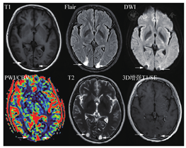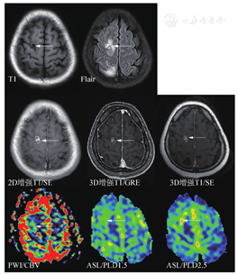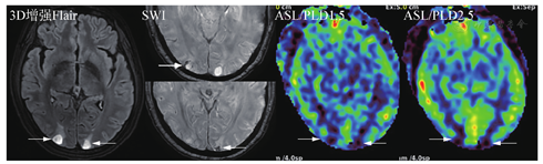 为了增加诊断信息和科研需求,可依据实际情况选择额外MRI序列,包括SWI、ASL及前面提到的增强后Flair等(图6)。笔者体会是转移瘤出血非常常见,常规MRI一些序列也可以分辨,但SWI显示更好。ASL的价值也有很多研究报道,转移瘤因瘤内成分不同而显示高、低灌注或混杂信号,在以囊性为主病灶中分辨率有限。但在鉴别转移瘤和非肿瘤病变中有价值,ASL值得推荐。但ASL扫描时间较长,且图像有变形,解读时以黑白图像评估可能更可靠。