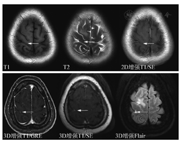 另外,DWI由于非常有诊断价值和扫描时间短,建议始终放在平扫序列里。而注射造影剂前的平扫中,只扫Flair序列,T2放在增强后扫描。优化标准中,主要增加了DSC灌注扫描(可能对鉴别肿瘤复发和放射性坏死有用)、增强后Flair(显示软脑膜转移病变较常规增强T1MRI效果好)以及增强后长时间延迟扫描(60~105 min,以期显示小病灶)。关于增强后Flair序列,对于脑膜转移的增强显示能力已被认可。对于脑实质内的转移瘤病灶,并不能增加诊断信息,但是对于靠近皮质的表浅病灶,显示能力超过常规增强T1,详见图3、图4。不同MR扫描机的序列名称不同,但序列的本质一致。