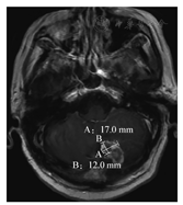 采用2015年发布的RANO-BM建议,依据2009年发布的RECIST1.1标准,评估中只测量脑实质内转移病灶,基线测量时靶病灶总数最多5个,可测量靶病灶需要实性强化最大单径≥10mm,不包括囊和腔[11],见图7。