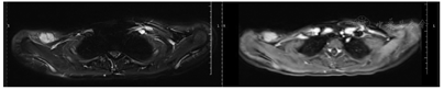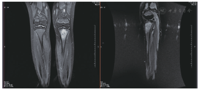 在自行停药3个月后,患者在肩峰处再次扪及肿物,于2019年12月12日再次返我院全麻下行右锁骨尤文肉瘤术后化疗后复发扩大切除术。术后病理结果:(右侧肩背部)小圆细胞恶性肿瘤,结合病史及形态,考虑为尤文肉瘤复发。2020年2年20日开始行术后辅助放疗,PGTVtb 56Gy分28次,PCTV50.4Gy分28次,共完成28次放疗。患者出院后于2020年9月2日出现左胫骨内侧隐痛可忍受,当地医院就诊,左膝关节DR结果:未见异常。未予处理。2020年10月6日左胫骨内侧疼痛加剧,2020年10月9日我院MRI提示右侧锁骨术区未见肿瘤复发(图2)。左侧胫骨干骺端-骺板-骨骺区骨质破坏,于2020年10月16日行左胫骨肿物穿刺活检术,术后病理结果:(左胫骨肿物)结合病史,符合尤文肉瘤。完善相关检查,排除其他部位的转移后,考虑患者为左胫骨上端孤立性复发转移,遂于2020年10月29日行左胫骨近端肿瘤扩大切除、人工肿瘤假体置换术。目前患者仍在我院接受后续的辅助治疗。