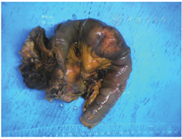 例1患者小肠一段,长42cm,一侧切缘周径4.5cm,另一侧切缘周径9.0cm。距4.5cm切缘23.0cm,距9.0cm切缘14.0cm处见一肿物,肿物大小11.0cm×6.0cm×2.5cm。肿物中央部缺损,呈穿透性空腔状,穿透肠管,侵及肠系膜,周边实性,切面灰粉灰黄色,质软脆,烂鱼肉状。其余肠黏膜皱襞尚好,未见著变。查见肠系膜淋巴结10个,最大者最大径1.3cm,最小者最大径0.5cm。另见肿物2个,大小分别13cm×6cm×4cm和14.0cm×7.5cm×4.0cm。表面尚光滑无包膜,切面灰白灰褐暗红色,质软脆,烂鱼肉状。