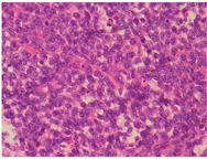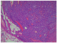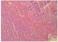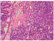 患者男,36岁。10d前无明显诱因出现腹痛,为右侧腹持续性胀痛,阵发性加重,程度中等,无他处放射;伴有恶心、呕吐,为非喷射性呕吐,呕吐物为含胆汁胃液,无咖啡色液体;肛门排气减少,无排便,无腹泻黑便,无黏液及脓血,无里急后重。无畏寒、发热、皮下出血。10d来逐渐出现消瘦、心慌、口渴、心悸、头晕。曾于当地医院就诊,行腹部CT示"横结肠肠壁增厚狭窄,考虑肿瘤",临床诊断为"横结肠肿瘤并梗阻",并以"肠梗阻"给予治疗。效果不佳,为求进一步治疗于2016年2月11日来我院,收入院治疗。患者自发病以来精神状态较差,睡眠一般,小便正常,体力情况较差。实验室检查白细胞计数9.59×109/ml,红细胞计数3.46×1012/ml,血红蛋白108g/L;免疫学检查肿瘤生长因子70.00U/ml;大便常规+潜血(-)。完善相关检查后行部分小肠切除术,术中见腹腔内少量腹水,肝、胆、胃、脾、盆腔、结肠及系膜均未见明显异常。距屈氏韧带60cm处小肠见一约15cm×8cm大小肿物,侵透浆膜,近端肠管显著扩张,余小肠及系膜未及明显异常。决定行部分小肠切除术。既往2014年4月15日曾行软组织彩超发现"左大腿外侧及左侧腹股沟肿物",于4月22日行肿瘤切除术。术中见肿瘤位于腹股沟外环口外侧,皮下层及腹外斜肌腱膜之间,大小5cm×4cm×3cm,将肿物完整切除。术后病理诊断为左大腿及左腹股沟EA。术后行4个周期化疗。2015年4月1日因左腹股沟肿瘤复发入院,4月9日手术切除,术后病理组织像同前,诊断EA复发。