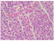 例2患者上皮样肿瘤细胞呈实性片状排列,位于黏膜下、肌层及浆膜层。瘤细胞呈圆形及卵圆形,核大淡然,异型性更明显;可见大红核仁,局部可见血窦及血管网结构;间质可见慢性炎细胞浸润(图6,图7图8)。与1年前左肺上叶EA肿瘤组织学结构类似(图9)。