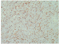 2例肿瘤细胞均表达Vimentin、CD31、Fli-1、ERG(图10,图11);部分表达D2-40;不表达CD34、CD99、SMA、S-100、SOX-10、CD117、Dog-1、CD3、CD20,例1 Ki67阳性细胞指数约95%,不表达CKpan;例2 Ki67阳性细胞指数约70%,表达CKpan(图12)。