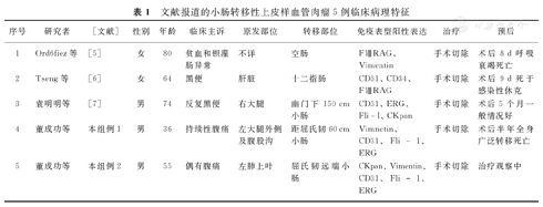 | 5 | 董成功等 | 本组例2 | 男 | 55 | 偶有腹痛 | 左肺上叶 | 屈氏韧远端小肠 | CKpan、Vimentin、CD31、Fli-1、ERG | 手术切除 | 治疗观察中 |