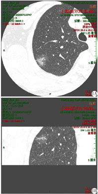 肺微浸润腺癌临床上常见,甲状腺乳头状癌肺转移亦不少见,但两种癌同时出现在肺同一位置临床上鲜有报道。甲状腺乳头状癌是甲状腺癌中最常见类型,占甲状腺恶性肿瘤45%~70%[1],呈低度恶性;尤其多见于年轻女性和儿童,女性约为男性的3倍,在甲状腺可局限存在数年[2]。但随年龄增长发病率增加,年龄≥40岁者预后较<40岁者差,几乎所有因甲状腺乳头状癌致死的均为≥40岁患者[3]。血道转移常见部位为肺,可以是粟粒状微小结节(只有131I扫描才能发现),也可以肉眼影像学可见的圆形结节;转移至肺、骨等远处器官预后较局部淋巴结转移者差。本例患者18年前曾行"甲状腺肿瘤"切除术,术后颈部淋巴结有转移,又在疾患肺癌基础上发生了肺转移,而且在肺组织同一部位,实属少见。