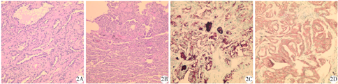 2020年9月3日患者行胸腔镜辅助小切口右肺上叶楔形切除术。术中见右肺上叶后段扪及大小约2 cm×1 cm肿物,质地硬,表面不光滑,活动度差;未扪及肿大的肺门淋巴结。术中切除肿物及周围肺组织送快速冰冻。冰冻报告为右肺上叶考虑为肺微浸润性腺癌。取7组淋巴结送检,并清扫纵隔淋巴结。术后病理报告示肿物大小1.8 cm×1.0 cm× 0.5 cm,紧邻被膜,切面灰白色,质软,与周围组织分界欠清。显微镜下见肿瘤主要成分大部分呈贴壁状生长的原位腺癌(图2A),局灶上皮细胞具有轻-中度异型性,呈腺泡状生长,直径范围<0.5 cm;肿瘤周围见散在小灶性上皮细胞呈乳头状排列(图2B),细胞核呈圆形,毛玻璃样,可见核沟及核内包涵体。免疫组化结果示Ki-67阳性细胞数< 10%,甲状腺转录因子-1、细胞角蛋白19、甲状腺球蛋白(图2C)、丝氨酸/苏氨酸激酶V600E-auto(图2D)转移性甲状腺乳头状癌细胞均阳性;细胞角蛋白7、天冬氨酸蛋白酶肺微浸润性腺癌细胞均阳性。结合患者既往甲状腺手术病史,病理诊断为肺微浸润性腺癌,癌旁伴灶性微小转移性甲状腺乳头状癌,转移灶最大径约0.15 cm,肿瘤大小1.8 cm×1.0 cm×0.5 cm。