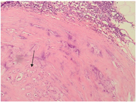术后患者于2020年9月15日转科住甲状腺外科继续治疗。2021年9月18日在全麻下行"功能性颈部淋巴结清扫术+区域性淋巴结切除术+残余甲状腺切除术",术后病理诊断为左6区淋巴结可见转移甲状腺乳头状癌(1/1)(图3);左侧残余甲状腺组织及左2、3、4及右3、4区淋巴结未见转移癌。患者术后恢复佳,病情平稳。