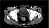 为进一步帮助诊断与治疗,需重点判断肿瘤的良恶性遂行CT引导下穿刺病理检查。CT穿刺结果示转移性腺癌。此时进一步完善全腹部CT等检查仍未见其他转移病变,建议行PET-CT检查,但患者及家属拒绝。因患者会阴部疼痛、坠胀不适剧烈,强烈要求手术,经术前多学科团队讨论,于2020年8月2日行经骶尾部直肠癌复发灶切除+前列腺、精囊腺切除+隧道膀胱、尿道会师术。肿瘤科考虑既往化疗方案有效,无靶向用药指征,免疫治疗患者不考虑,遂予以奥沙利铂+卡培他滨化疗;3个周期后患者出现奥沙利铂过敏,给予口服卡培他滨单药化疗3个周期;术后4个月(2020年12月18日)复查盆腔MR、肿瘤系列癌胚抗原均为阴性;后因新冠肺炎疫情影响,患者复查不规律,于2021年10月份再次出现会阴部坠胀感,复查盆腔MR检查考虑骶前复发,患者要求上级医院就诊。
