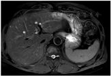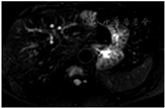 患者于2013年10月18日行开腹直肠癌腹会阴联合切除术、腹腔淋巴结清扫术,术后病理分期T3N0MO。但考虑淋巴结取检数目较少,T分期晚,决定给予术后辅助化疗。于2013年11月2日至2014年3月29日行奥沙利铂+氟尿嘧啶方案药物化疗6次。患者术后每年复查腹部彩超、肿瘤系列检查,2016、2017、2018年腹部彩检查均未见肝脏、腹腔转移征象,癌胚抗原检查分别为2.64、14.55、10.12 ng/ml。患者2018年3月癌胚抗原升高,2个月后复查仍明显高于正常指标。此时考虑不除外转移可能,建议患者完善PET-CT检查。外院PET-CT检查示肝S2段高代谢肿块影,考虑转移癌(术后5年)。进一步完善肝脏MR检查(图2、图3)和肝脏超声造影,结果示肝S2段不均质回声区动脉期呈快速高增强,门脉期开始消退,延迟期消退明显,呈"黑洞征""快进快退"增强模式。诊断为肝脏转移癌?原发肿瘤?考虑患者为孤立病灶;PET-CT未发现其他转移病变,影像学评估肝脏病变可RO切除。